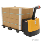 This Vestil electric pallet jack lifts and transports palletized loads efficiently between storage racks, loading docks, and production areas. Operators position the forks under the pallet, raise the load using the electric lift, and move it smoothly to the destination. Controlled lowering ensures safe and precise placement.